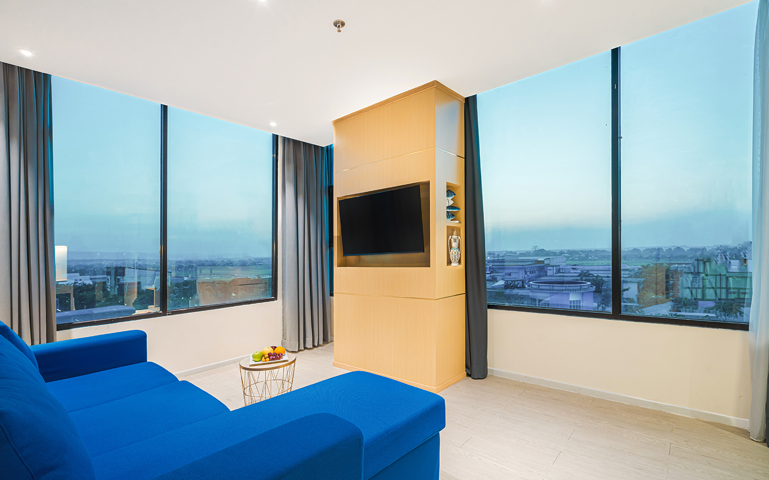 This spacious 52-square meter corner room with view of cityspace featuring separate living room and a plush king bed room, bathroom with a bathtub and a rainfall shower, and pantry.