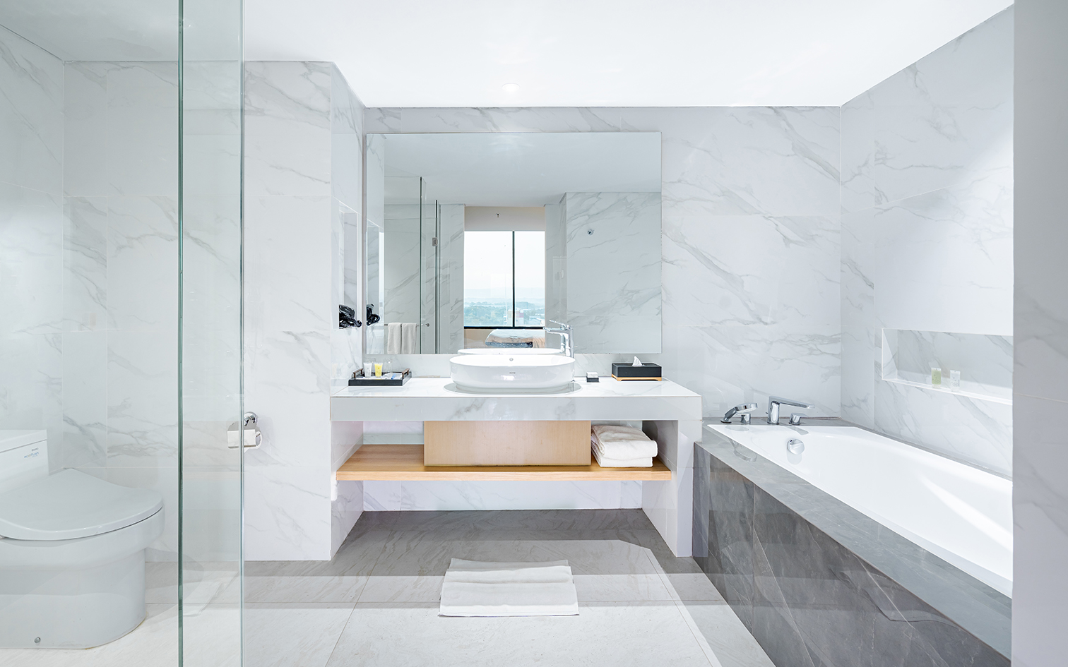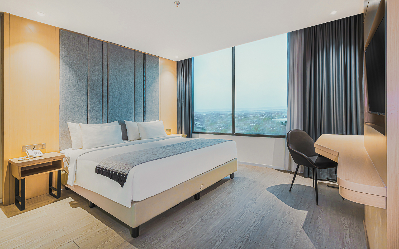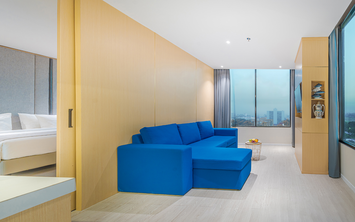 This spacious 52-square meter corner room with view of cityspace featuring separate living room and a plush king bed room, bathroom with a bathtub and a rainfall shower, and pantry.